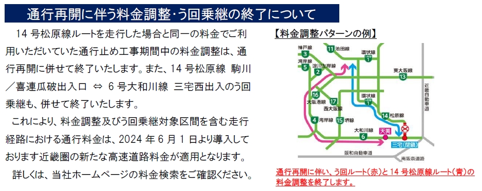 この長期間の通行止めにあたり、料金の調整がされていましたが、再開に伴い、料金調整、う回乗継が終了となりますので、ご注意下さい。