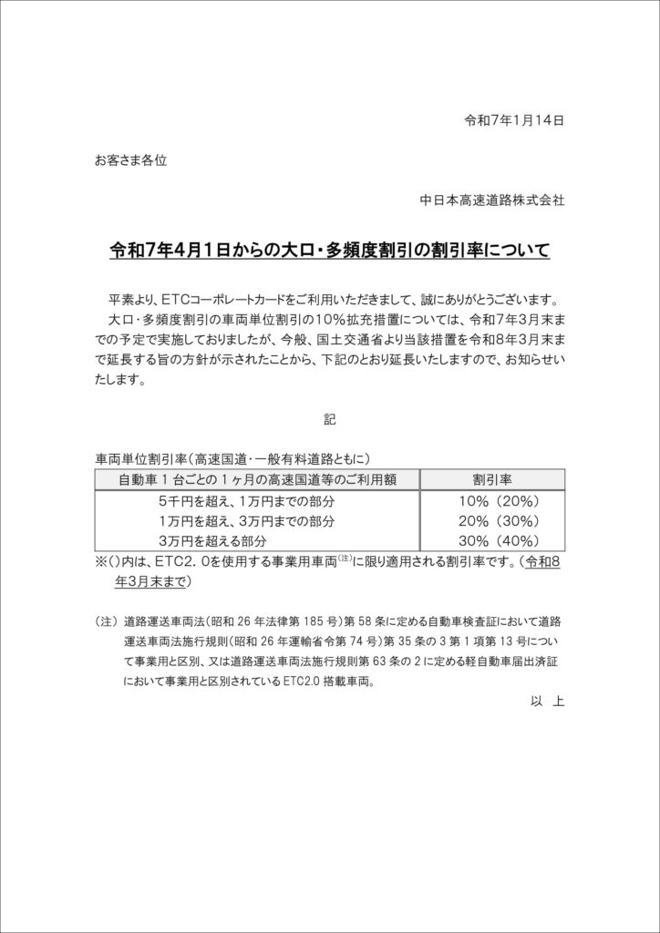 今回の割引延長は、ETC2.0を利用する自動車運送事業者に対し、大口・多頻度割引の最大割引率を40%から50%に拡充する措置です。