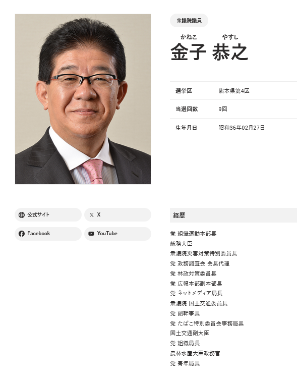 前任は公明党の中野洋昌氏でしたが、新任は自民党から「金子恭之」氏が任命されました。