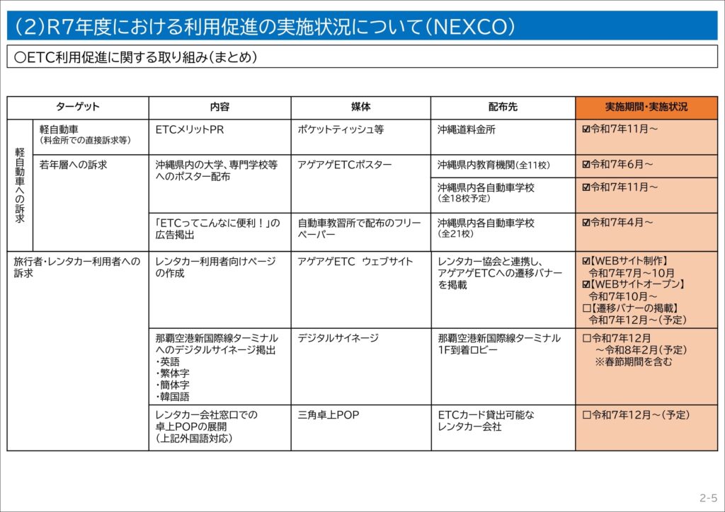協議会は定期的に開催されており、沖縄県とNEXCO西日本が共同で進める形で、ETC利用促進策や利用促進全般の実施状況・課題を共有し、改善策を検討しています。