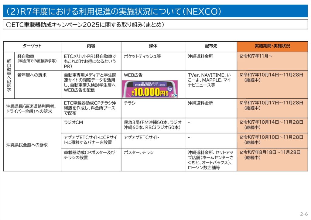 「ラジオCM」、料金所での「ポケットティッシュ配り」や自動車学校への「ポスター掲示」・「フリーペーパー配布」、那覇空港やレンタカー会社窓口での「デジタルサイネージ」・「POP展開」などが行れているとのこと。