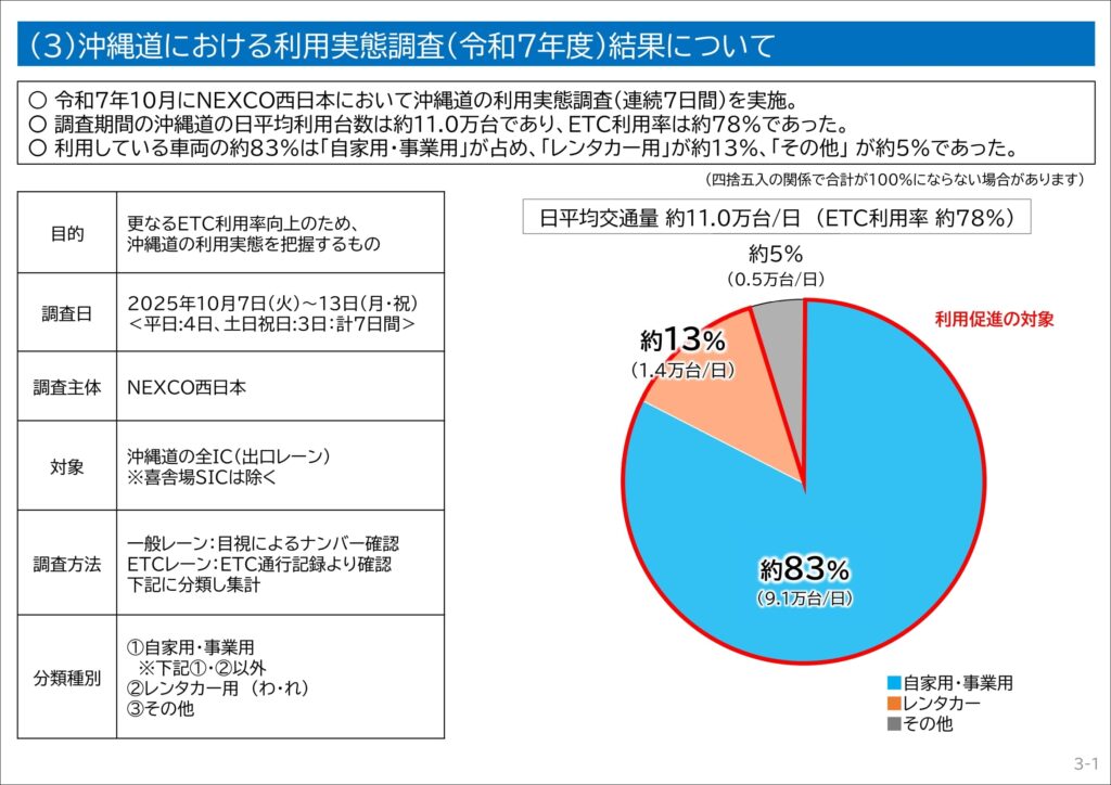 また、今回の協議会では、2025年10月に実施された沖縄自動車道の利用実態調査の結果についても報告がありました。