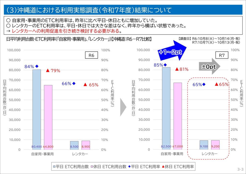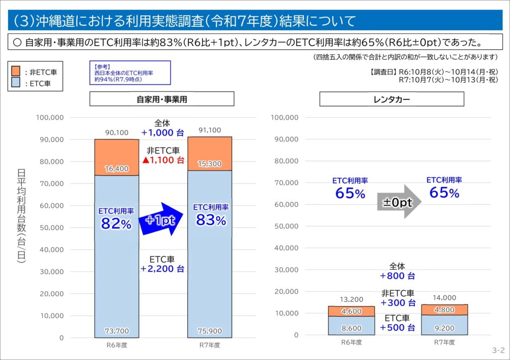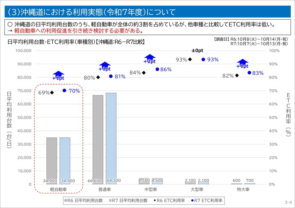 また、沖縄自動車道での軽自動車は全体の約3割を占めているが、他車種と比較してETC利用率が10%以上低いという結果が出ていました。