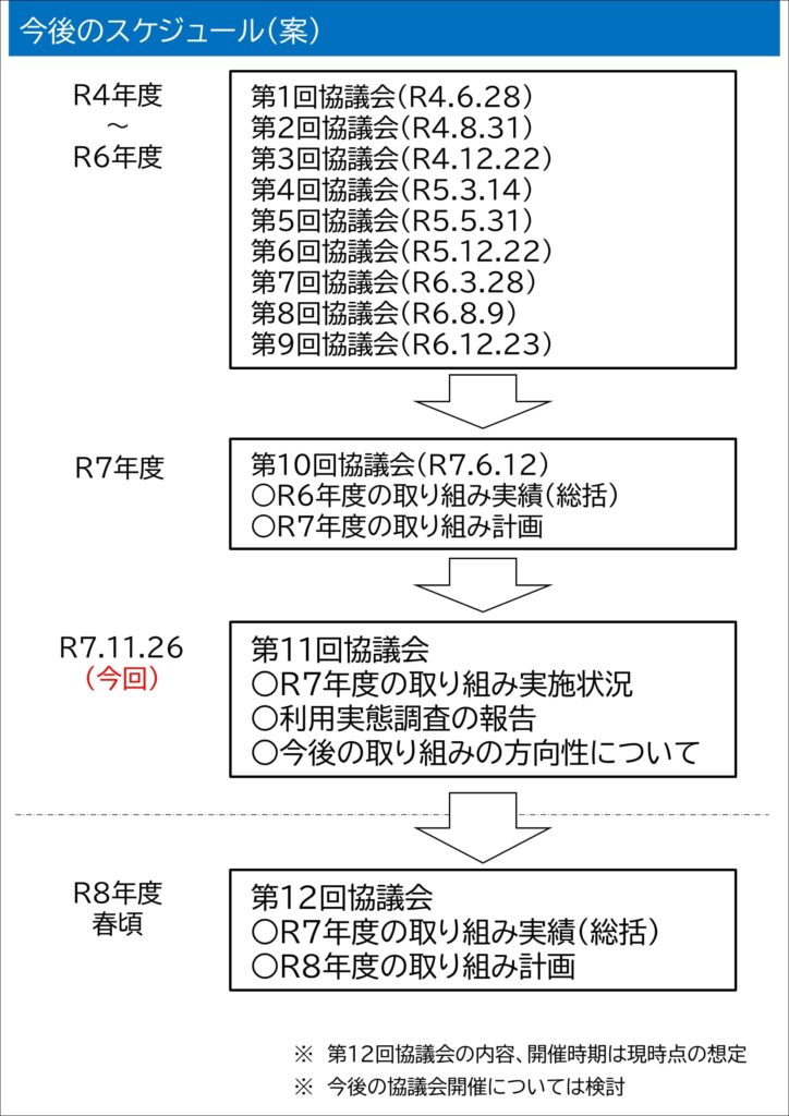 協議会は、2022年6月から定期的に実施され、今回で11回目となっていますが、2026年春頃に12回目を開催し、令和7年度の取り組み実績の総括と令和8年度の取り組み計画の検討を行う予定とされています。