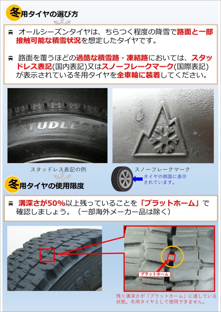- また、運行前に冬用タイヤの溝深さが新品時の50%以上残っていることを、「プラットホーム」で確認をお願いします。