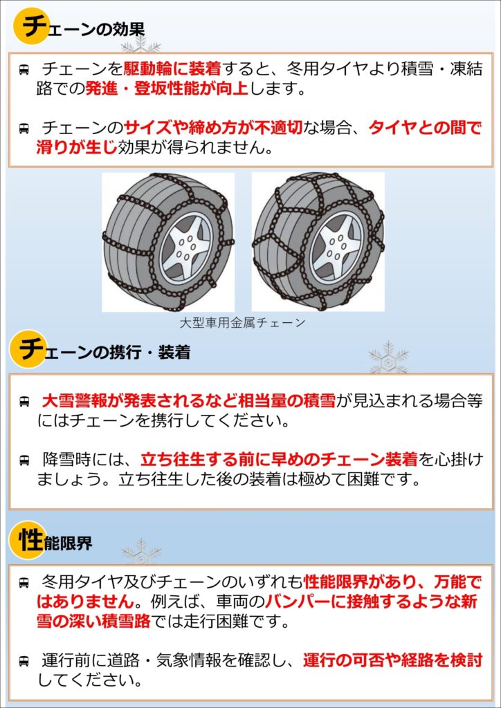 - チェーンの携行、立ち往生する前の早めの装着をお願いします。