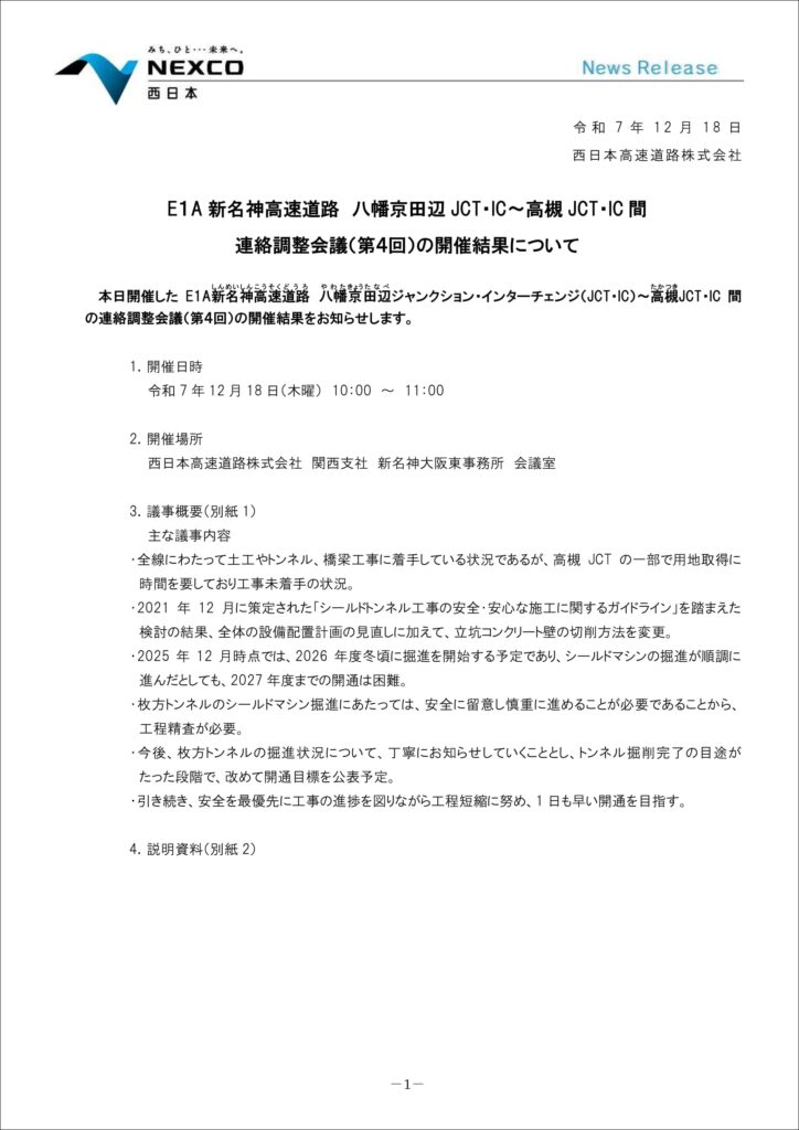 2025年12月18日に開催されました「新名神高速道路 八幡京田辺JCT・IC~高槻JCT・IC間 連絡調整会議(第4回)」の開催結果についてNEXCO西日本よりプレスリリースが出ております。