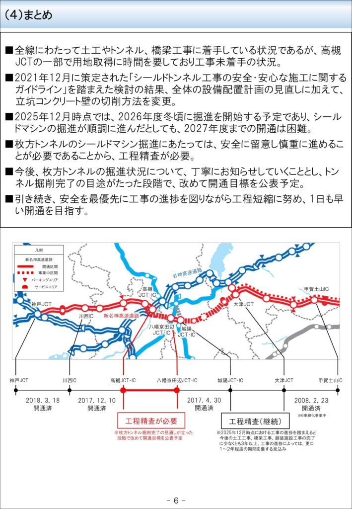 用地取得や工事進捗について、2025年12月18日に開催された「新名神高速道路 八幡京田辺JCT・IC~高槻JCT・IC間 連絡調整会議(第4回) 」で以下のように報告されました。