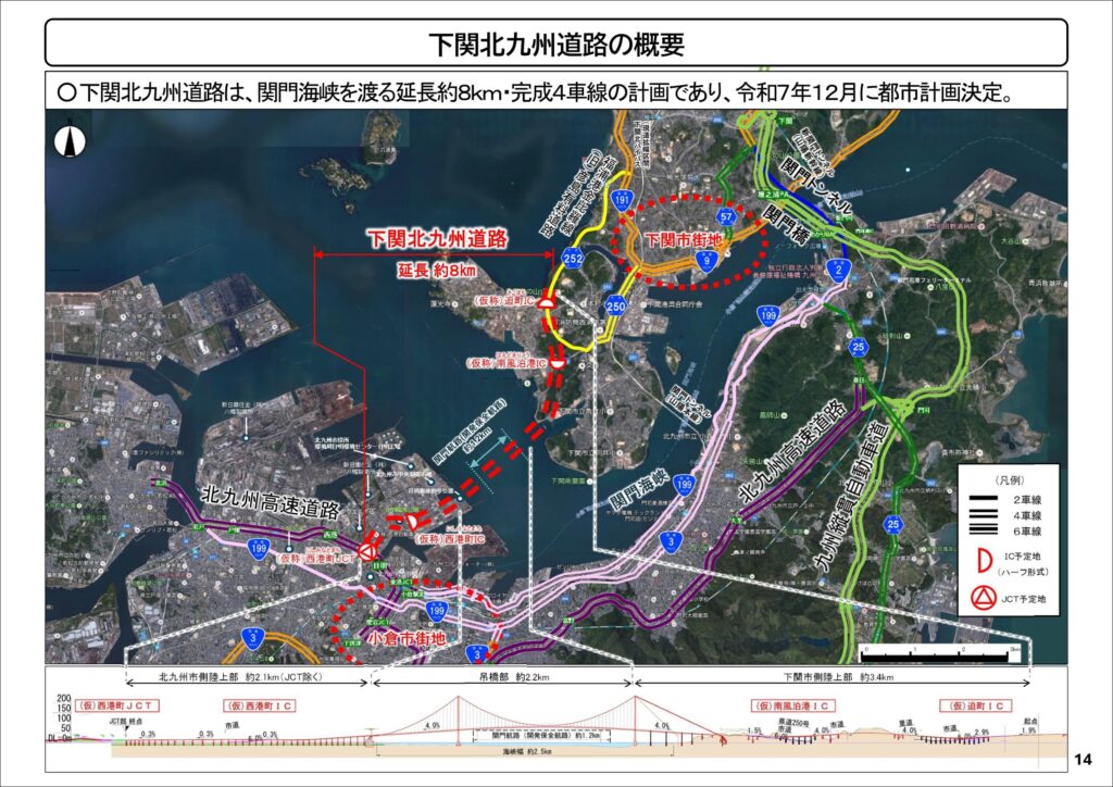 ルートは起点となる下関市の旧彦島有料道路に接続する場所と終点となる小倉北区西港町の北九州都市高速道路に接続するおよそ8キロで、この区間には下関市側に2か所と北九州市側に1か所のハーフインターチェンジが設置される構想となっています。