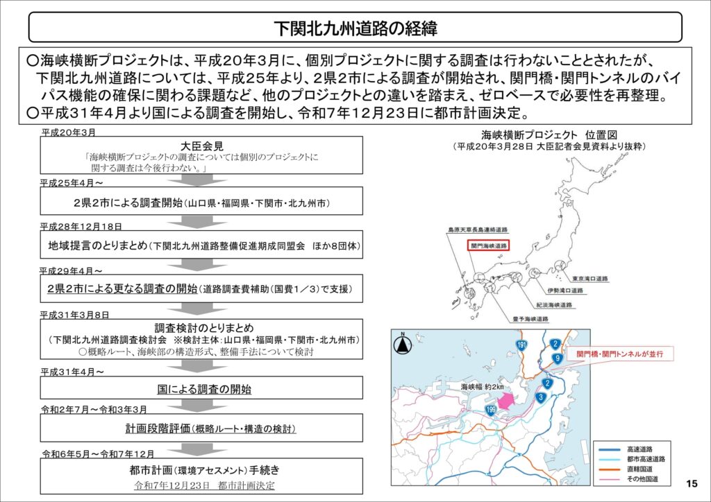 「下関北九州道路」については都市計画が決定しただけで、まだ事業主体や事業スキームなど骨格となる部分が決まっていません。