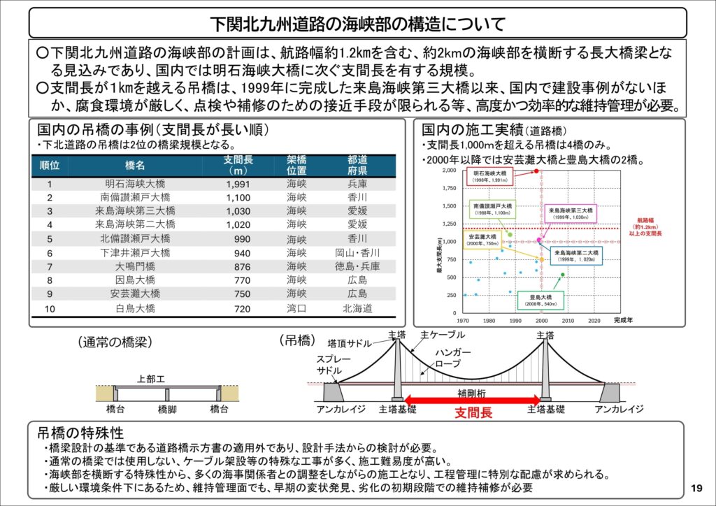 計画では、つり橋を支える柱の間は、国内最長の明石海峡大橋が1991mで、下関北九州道路は1500mとなっており、完成すれば国内2番目の長さになりそうです。