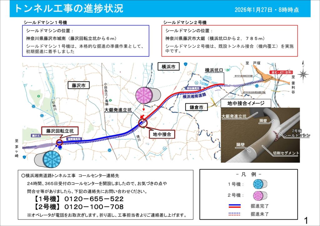 「横浜湘南道路」は、シールドマシン1号機は初期堀進に着手、シールドマシン2号機は地中接合を実地中。