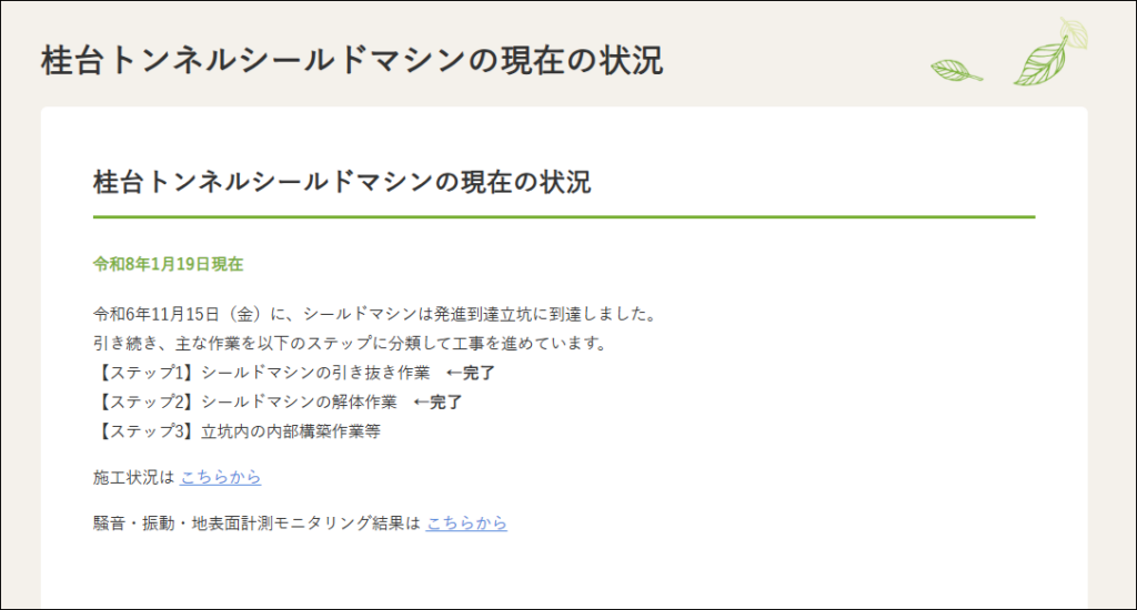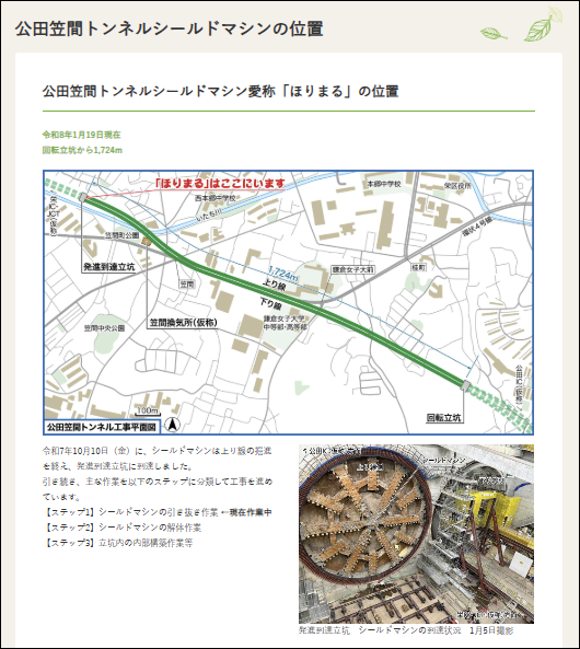 「ほりまる」は、2025年10月10日に「発進到達立坑」に到達したことにより、上り線、下り線の両方の堀進が完了、現在は「ほりまる」の引き抜き作業を実施しているとのこと。