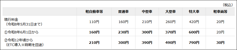普通車の場合、現行の160円から2026年6月1日に230円、2030年頃に300円とし、利用者の急激な負担増を軽減するため、段階的に引き上げを行うとのこと。