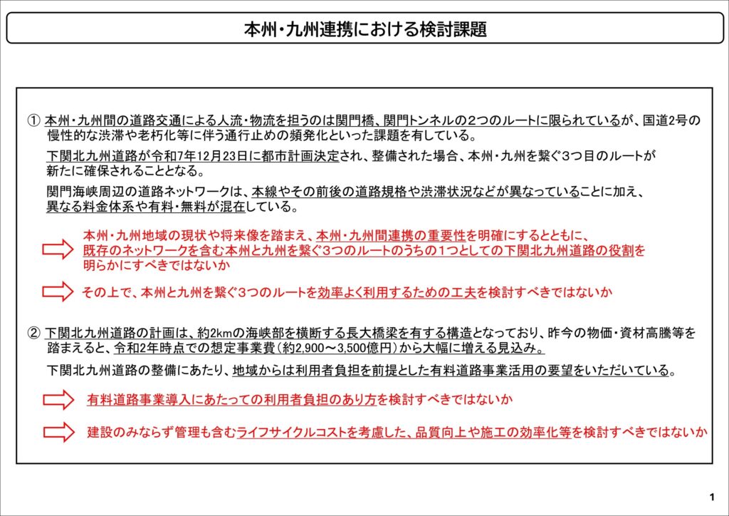 2025年11月時点における地域の要望としては、下関北九州道路の事業化に向けて、利用者負担を基本とした有料道路事業を最大限活用することとされています。