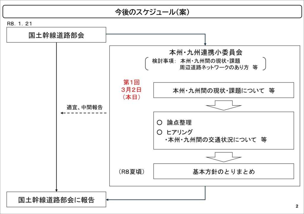今後については、検討課題について議論した上で、論点を整理し、本州・九州間の交通状況についてヒアリングを行い、2026年夏頃に基本方針をとりまとめるスケジュール案が出されました。とりまとめられた基本方針は、国土幹線道路部会へ報告される予定となっております。