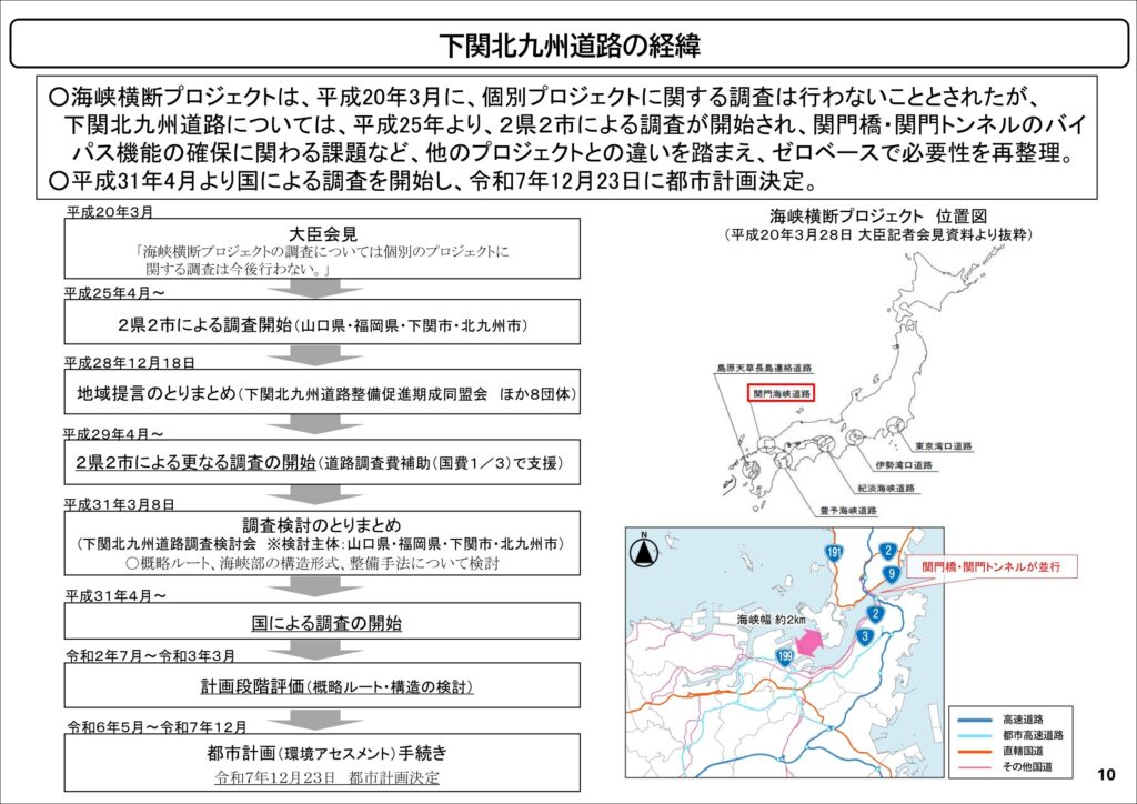 「下関北九州道路」については、これまで様々な紆余曲折がありましたが、山口県、福岡県、下関市、北九州市の2県2市による調査や地域提言のとりまとめを通じて、2019年に国による調査が開始され、概略ルートや構造の検討が行われた結果、2025年12月23日に都市計画決定に至りました。