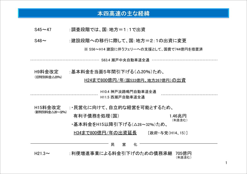 ところが、2010年4月に国土交通省が出資金の受け入れを2022年度までとした償還計画を前提とした本四道路の新料金案を示したことを契機として、2010年5月、10府県市が、2012年度以降の追加出資を行わないことを同省に申し入れたことから、国と10府県市との間で今後の出資について協議が行われることになりました。